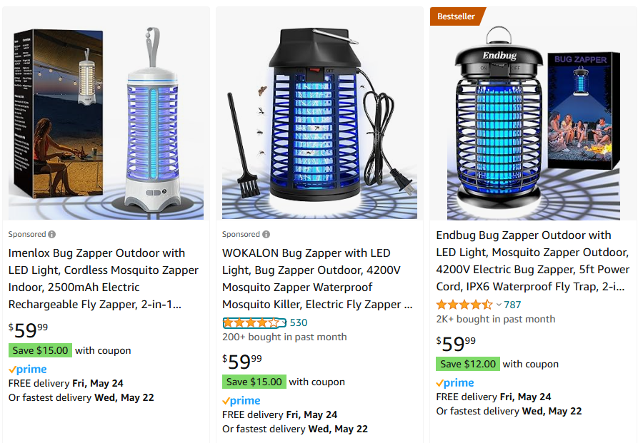 BUT, for some reason, almost ALL the anti-mosquito devices on there SUCK! I tried 7+ different brands and models, none of which worked well at all. My theory is their marketplace is just overcrowded with cheap Chinese knock-offs. Anyways, point is, there could be some good ones on Amazon but the vast majority are very, very bad.